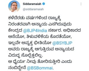 *ಕಳೆದೆರಡು ವರ್ಷಗಳಿಂದ ರಾಜ್ಯಕ್ಕೆ ನಿರಂತರವಾಗಿ ಅನ್ಯಾಯ ಎಸಗಿರುವುದು ಕೇಂದ್ರದ ಬಿಜೆಪಿ ಸರ್ಕಾರ. ಅಧಿಕಾರದ ಆಸೆಯೋ, ತಿಳುವಳಿಕೆಯ ಕೊರತೆಯೋ, ಇಲ್ಲವೇ ಅವ್ಯಕ್ತ ಭೀತಿಯೋ @BSYBJP ಅವರು ರಾಜ್ಯಕ್ಕೆ ಆಗುತ್ತಿರುವ ಅನ್ಯಾಯದ ವಿರುದ್ಧ ಸೊಲ್ಲೆತ್ತಲಿಲ್ಲ.